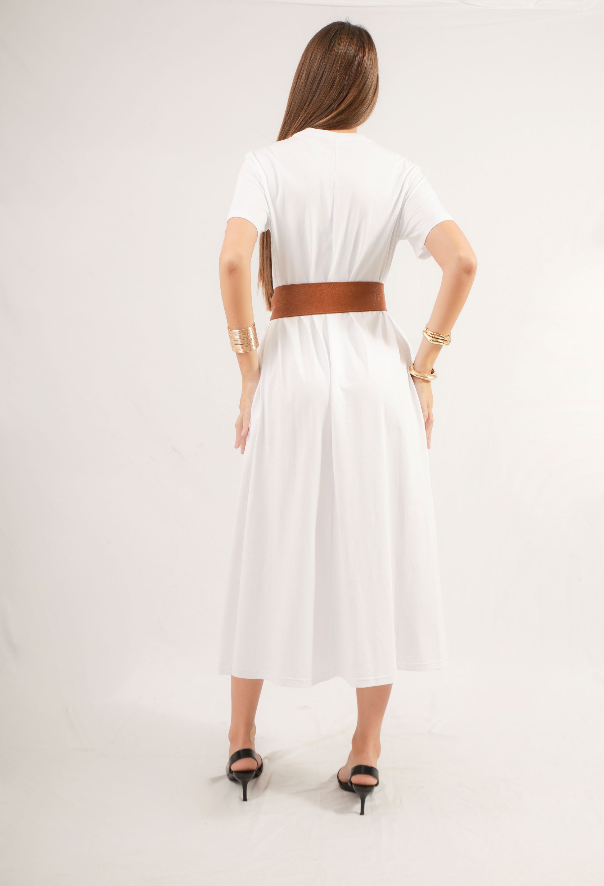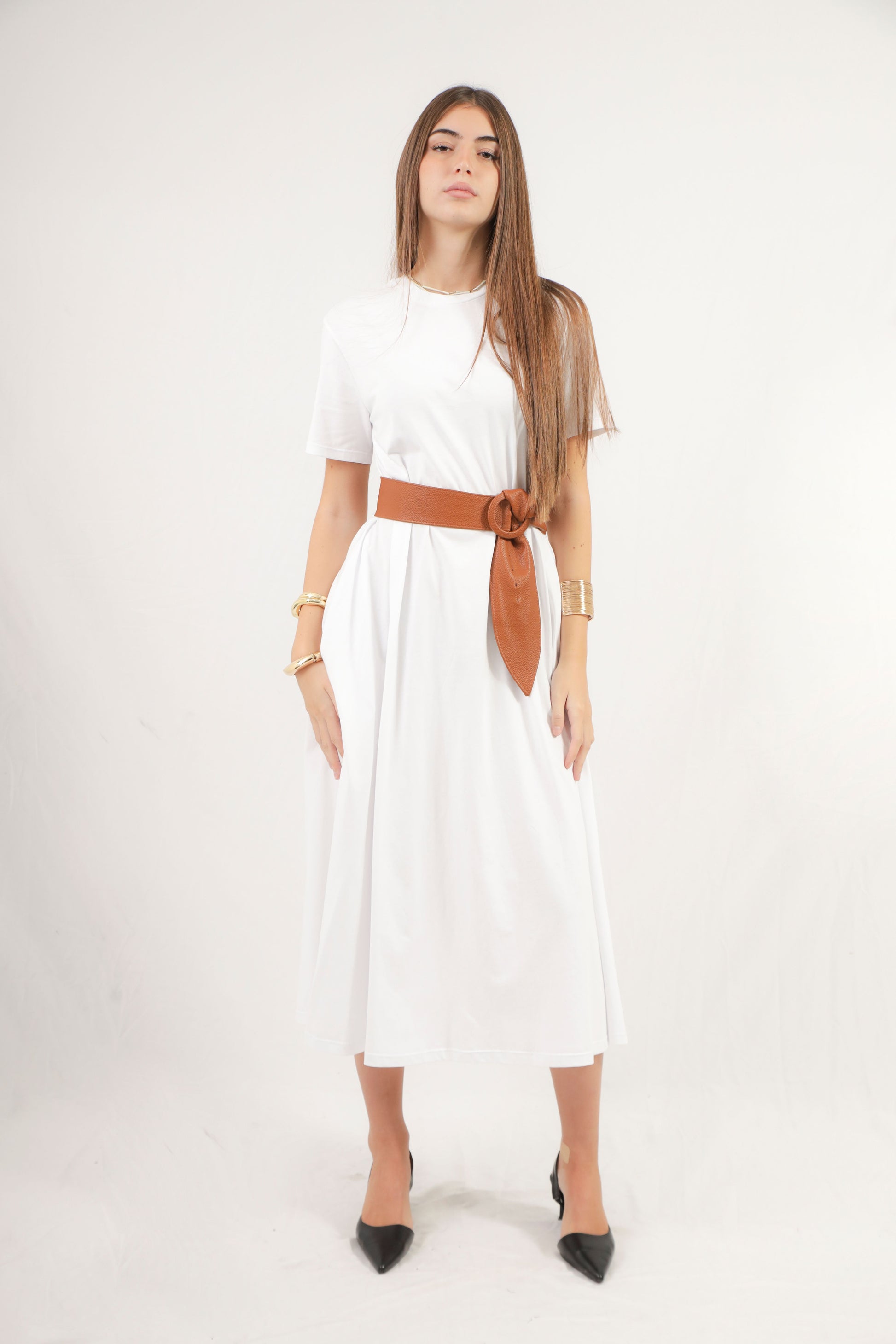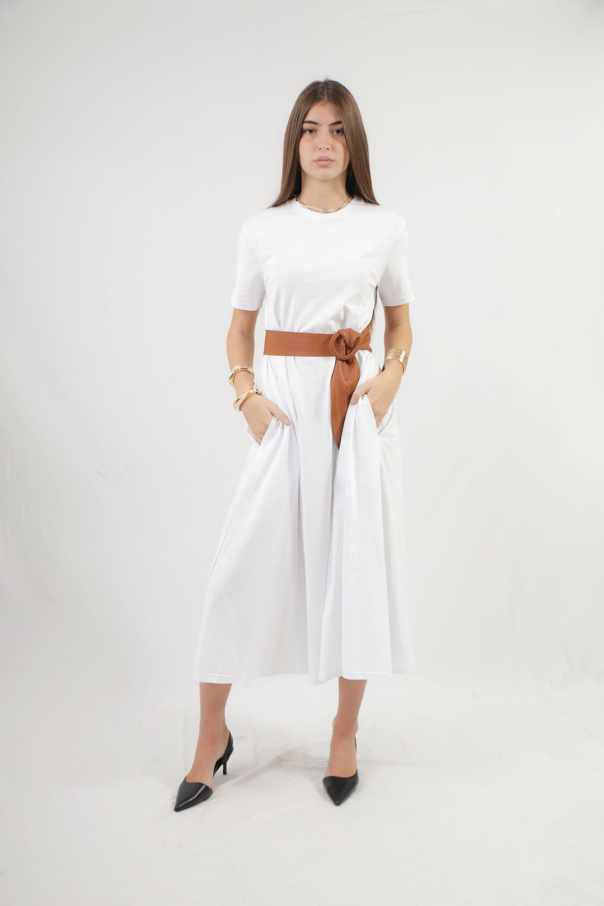 Questo abito lungo in cotone presenta un morbido fit che si adatta alla figura. Con uno scollo rotondo e tasche laterali, è perfetto per un look casual ma elegante. La sua linea svasata dona una silhouette sinuosa e comoda. Realizzato in cotone, garantisce freschezza e comfort per tutta la giornata.