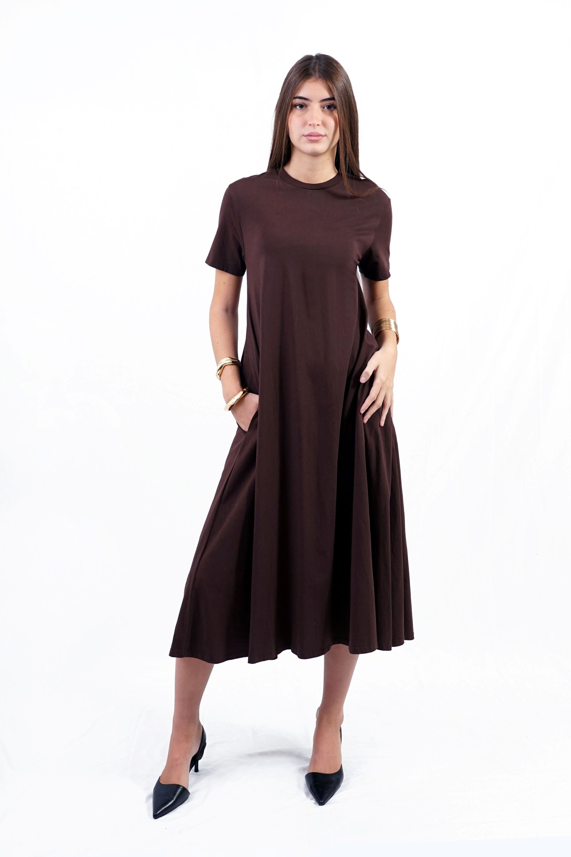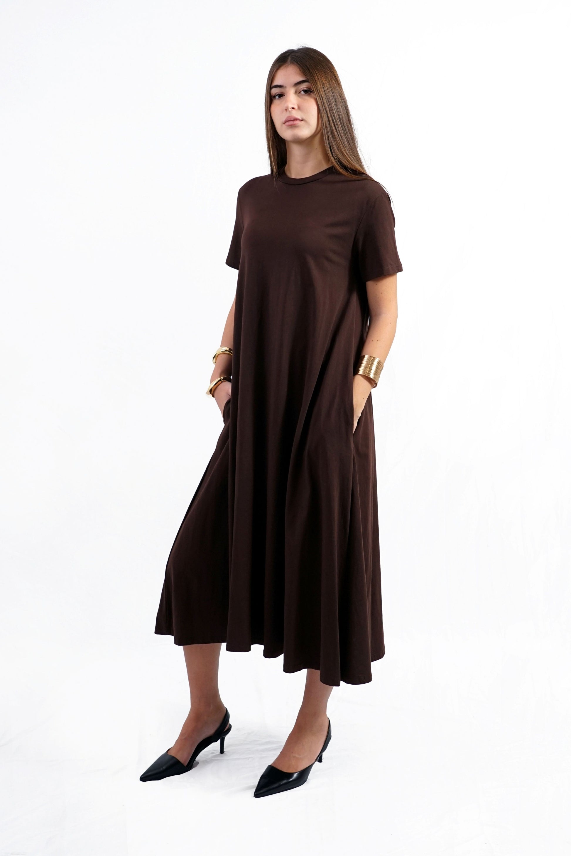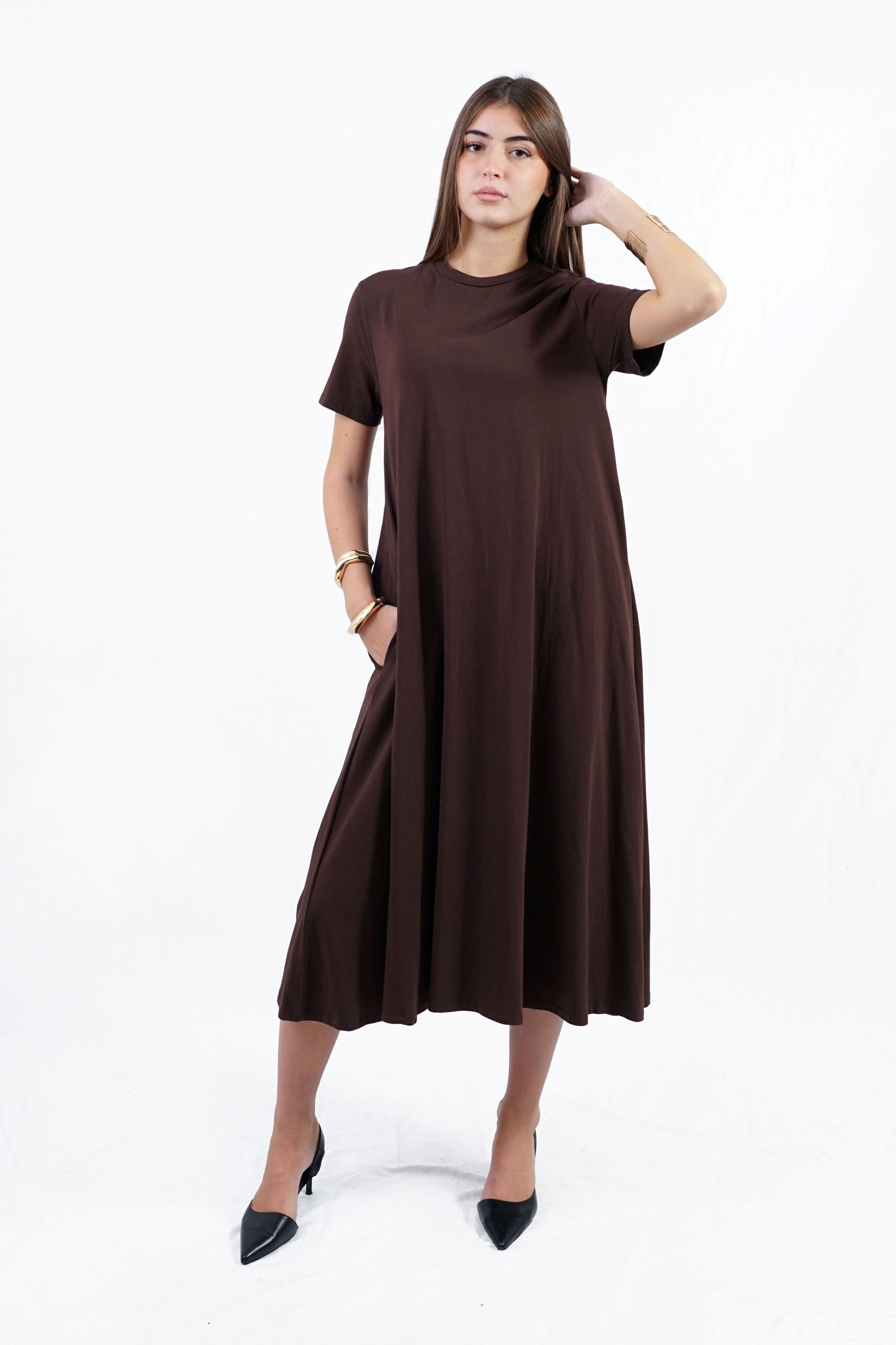Questo abito lungo in cotone presenta un morbido fit che si adatta alla figura. Con uno scollo rotondo a costina e tasche laterali, è perfetto per un look casual ma elegante. La sua linea svasata dona una silhouette sinuosa e comoda. Realizzato in cotone, garantisce freschezza e comfort per tutta la giornata.