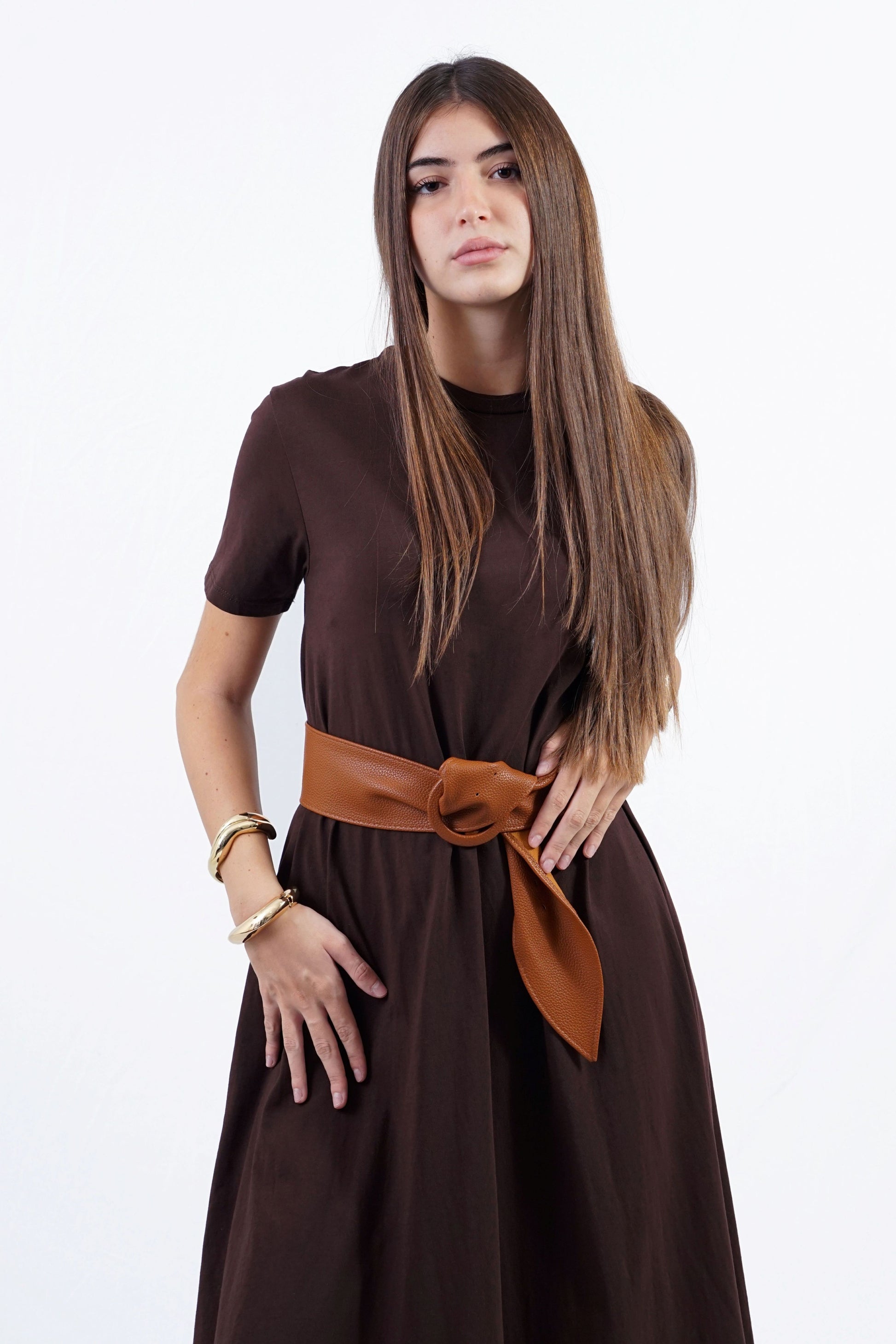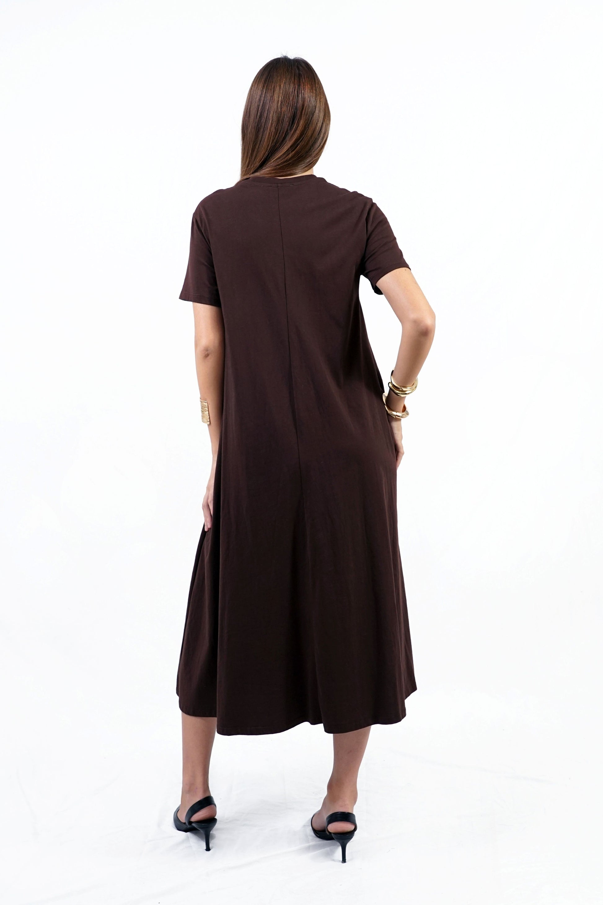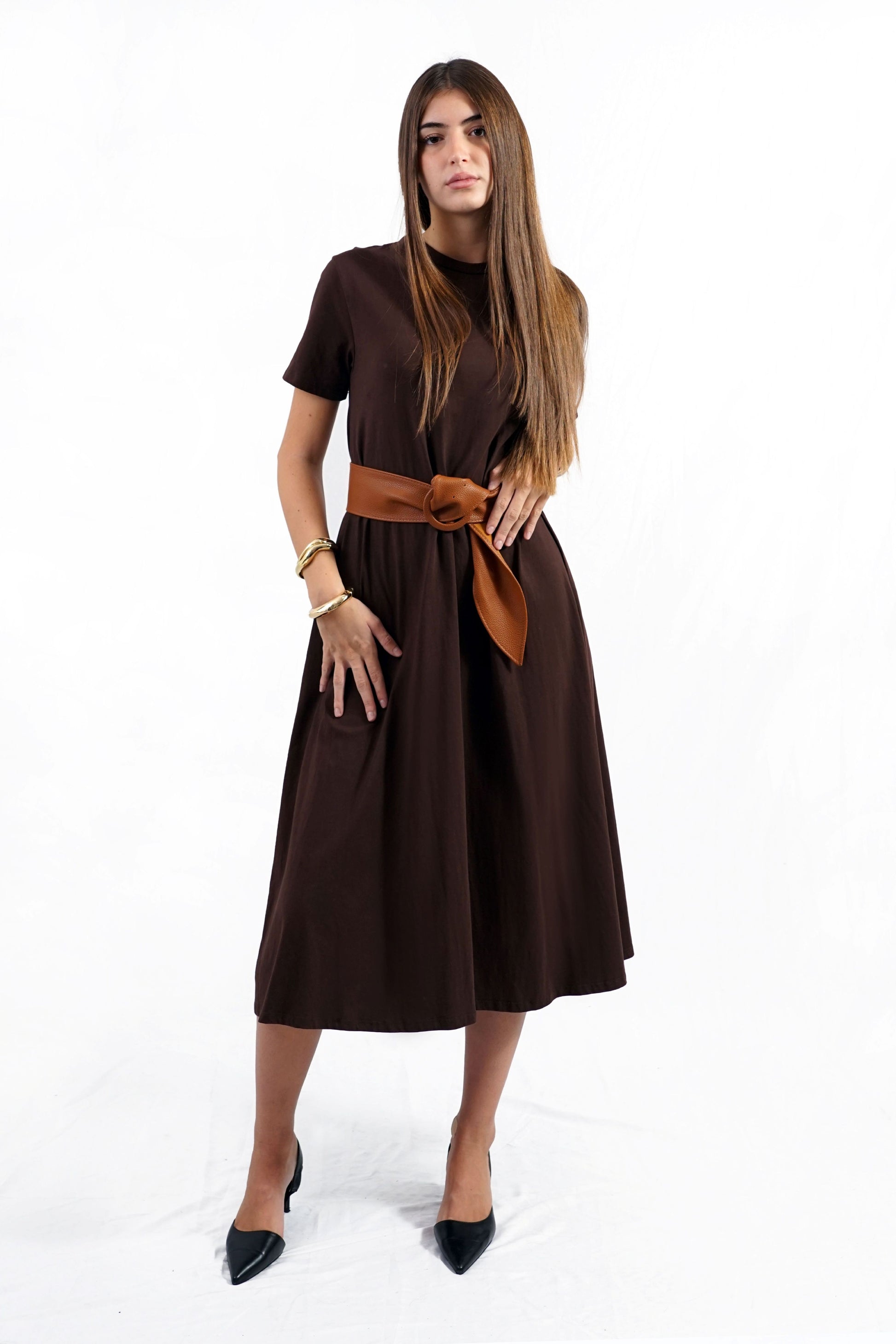 Questo abito lungo in cotone presenta un morbido fit che si adatta alla figura. Con uno scollo rotondo a costina e tasche laterali, è perfetto per un look casual ma elegante. La sua linea svasata dona una silhouette sinuosa e comoda. Realizzato in cotone, garantisce freschezza e comfort per tutta la giornata.