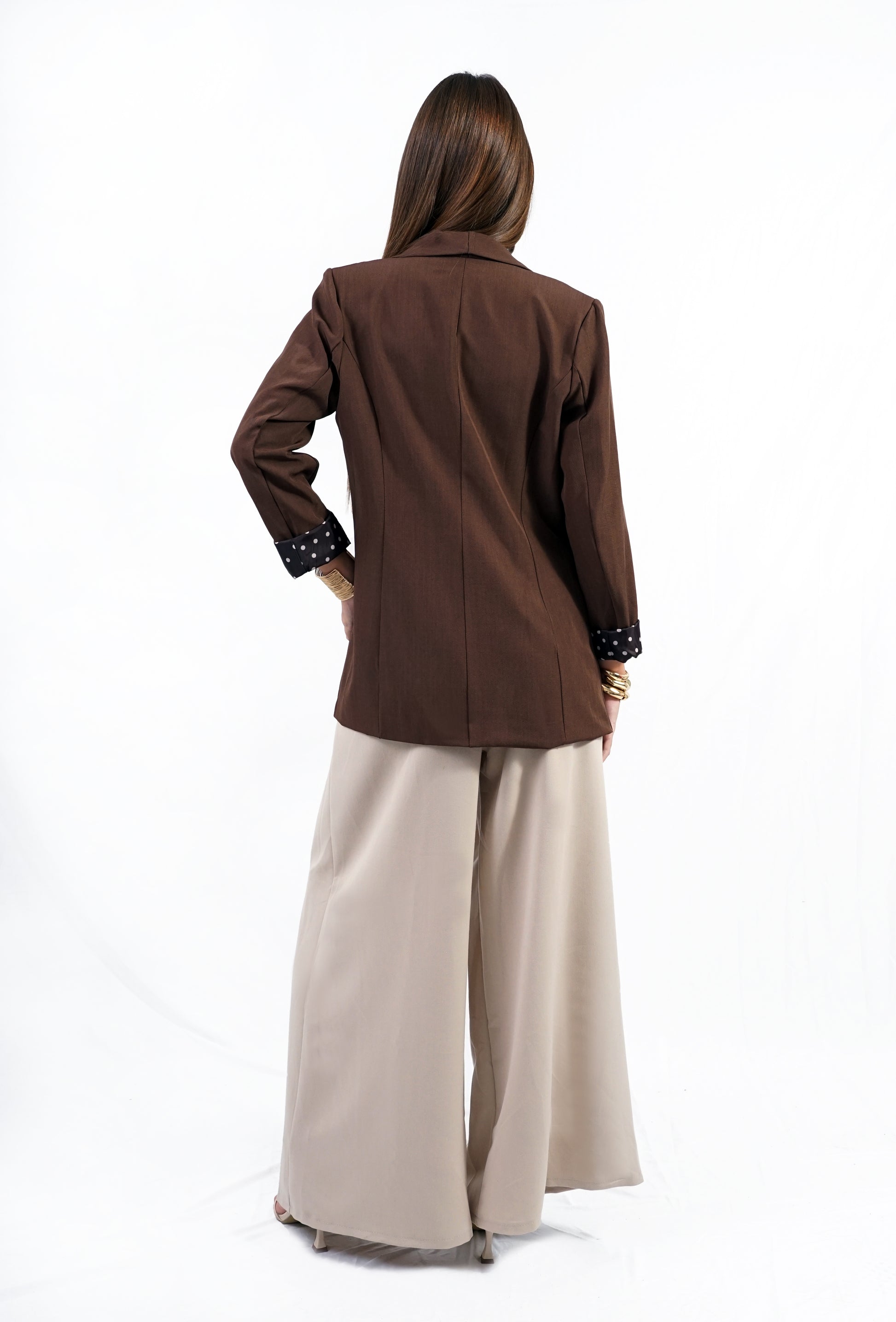 Dettaglio fodera e risvolto a pois bianchi in contrasto.