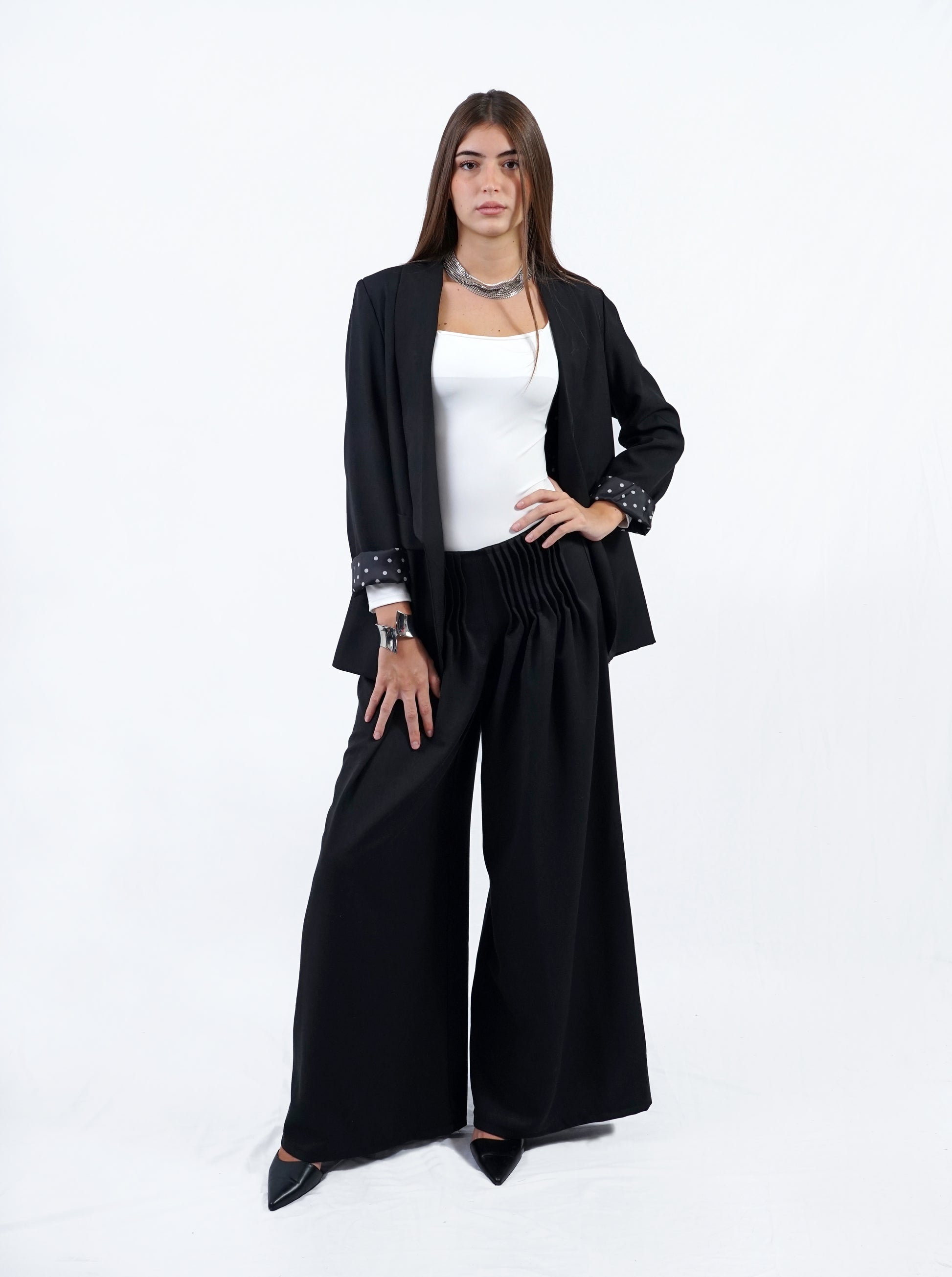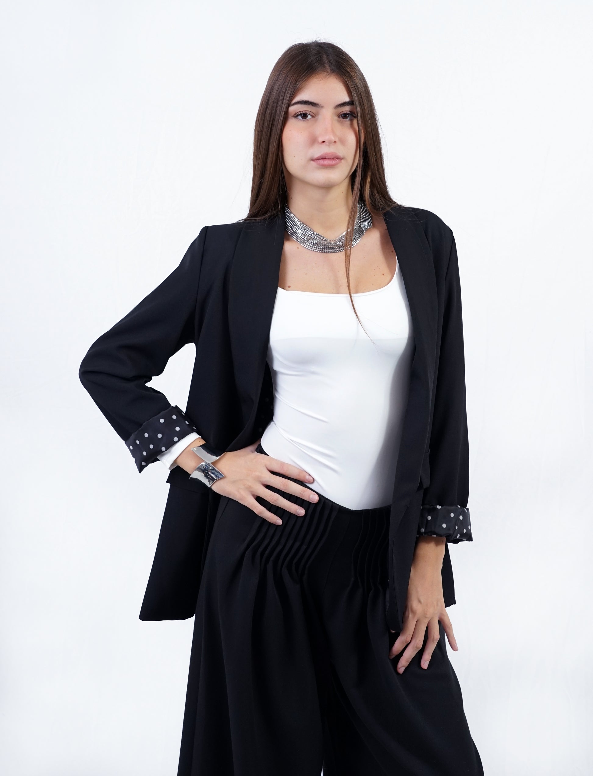 Dettaglio fodera e risvolto a pois bianchi in contrasto.