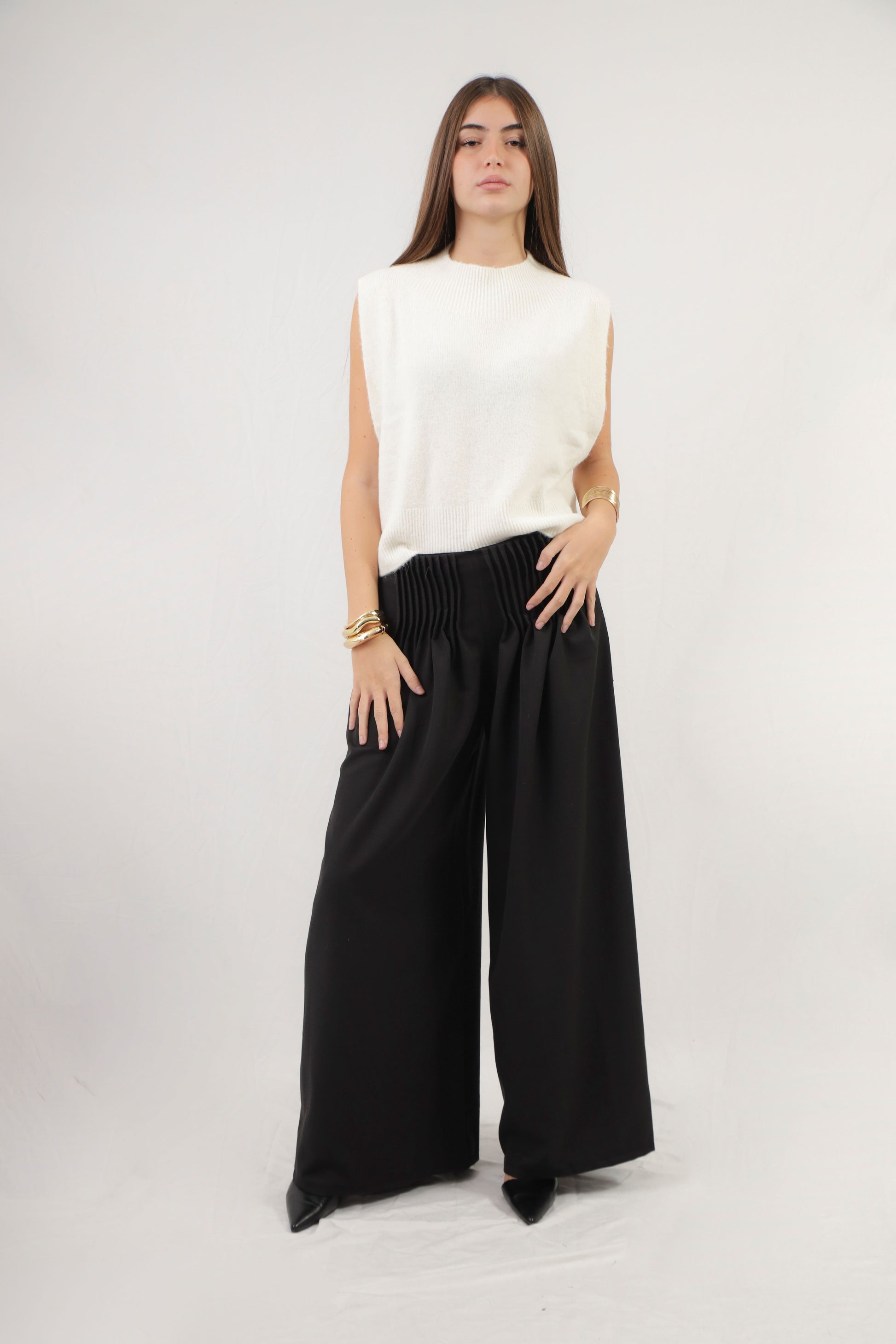 il maglione presenta un design morbido e senza maniche per una vestibilità comoda e rilassata.