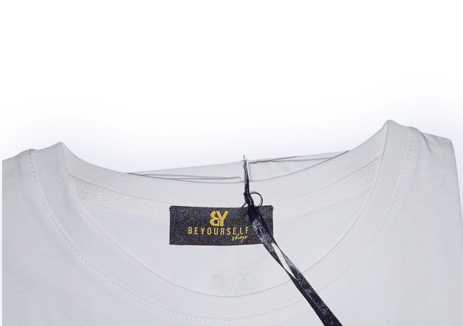 T-shirt girocollo tinta unita bianca con scritta beyourself frontale e logo BY sul retro