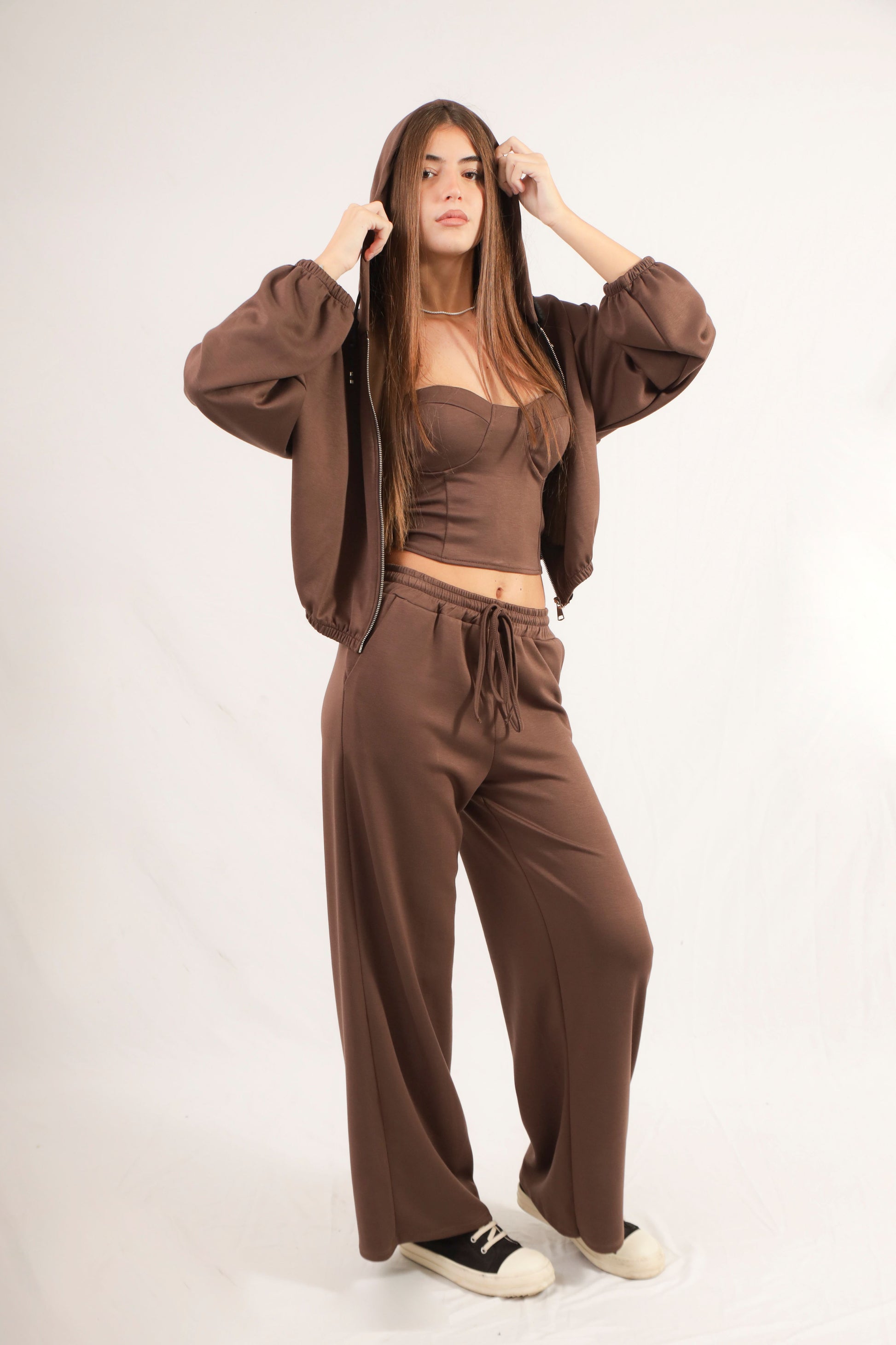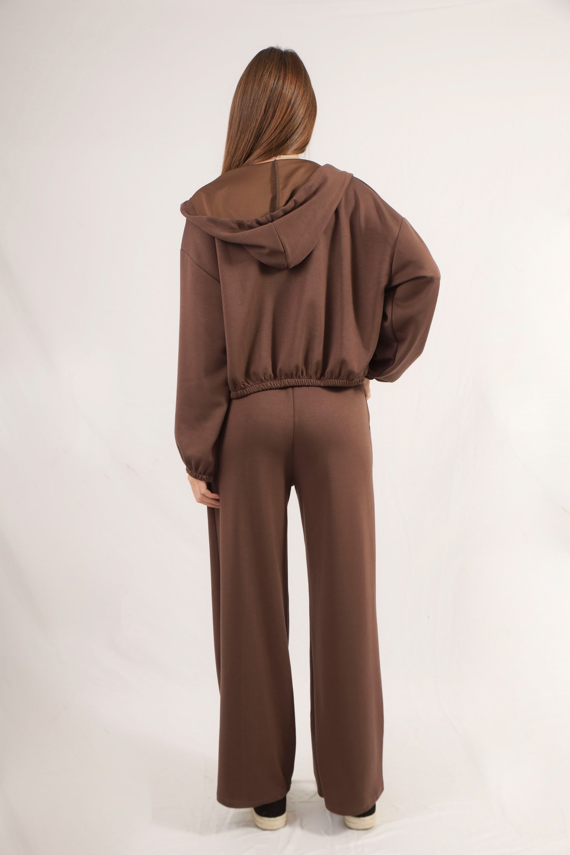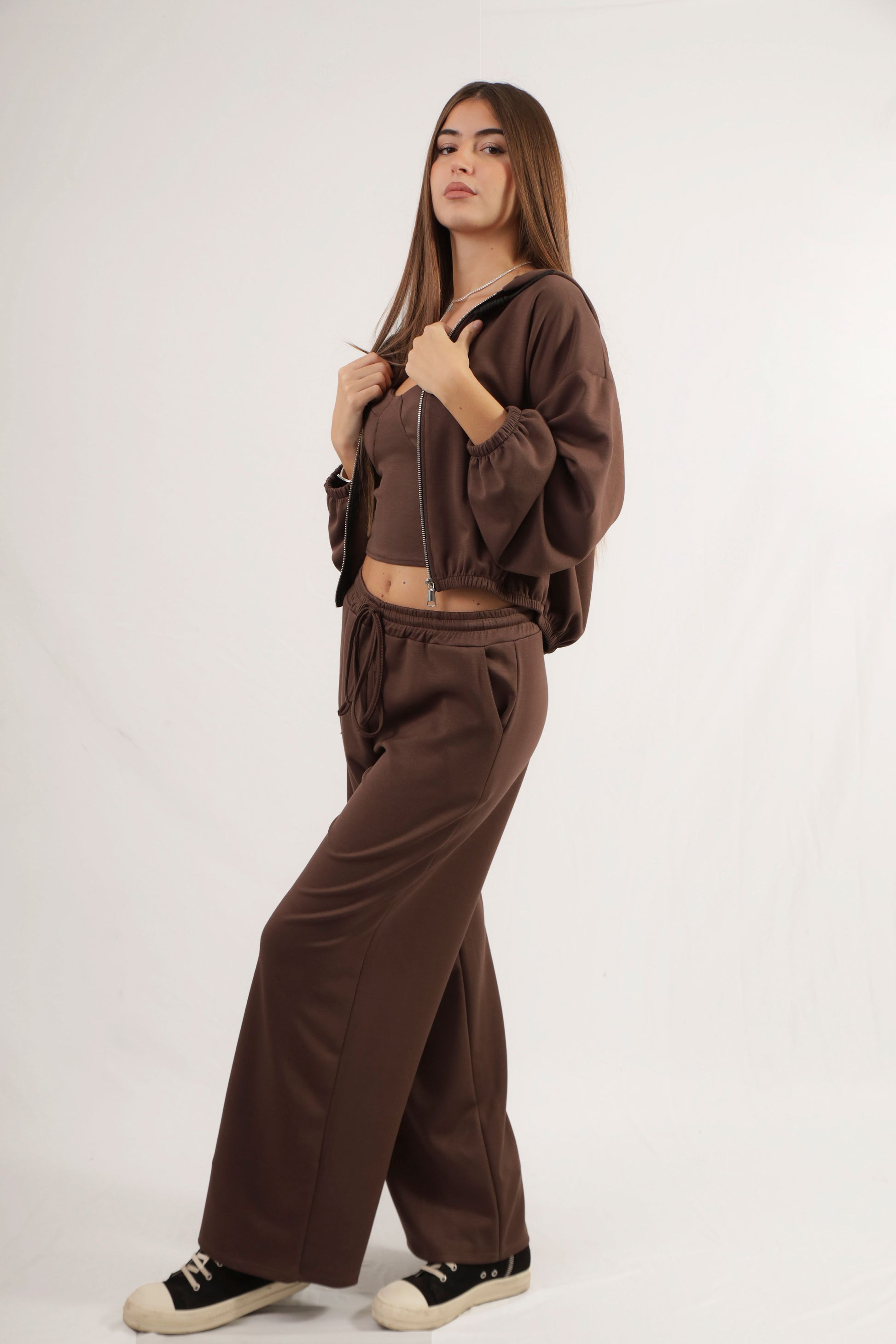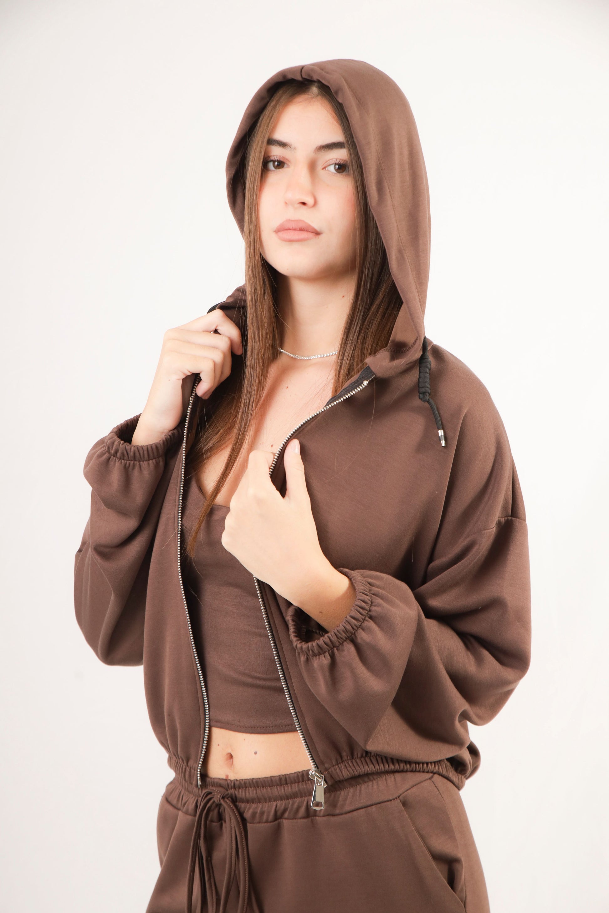 Felpa modello crop, con zip frontale e coulisse al fondo per regolare l'ampiezza. Le maniche sono ampie e leggermente a sbuffo. Pantaloni larghi con elastico e laccetto in vita. Colore cioccolato.