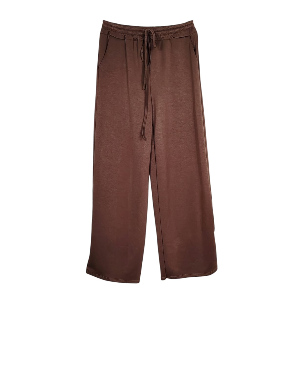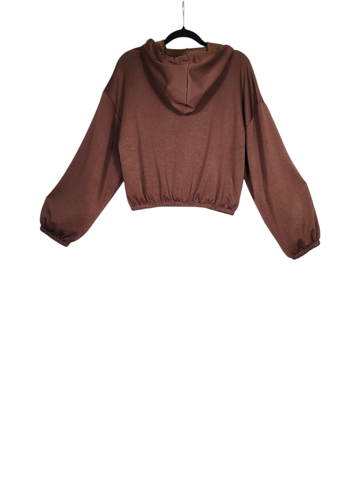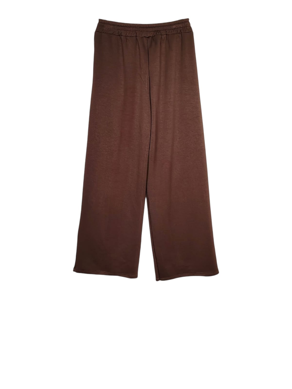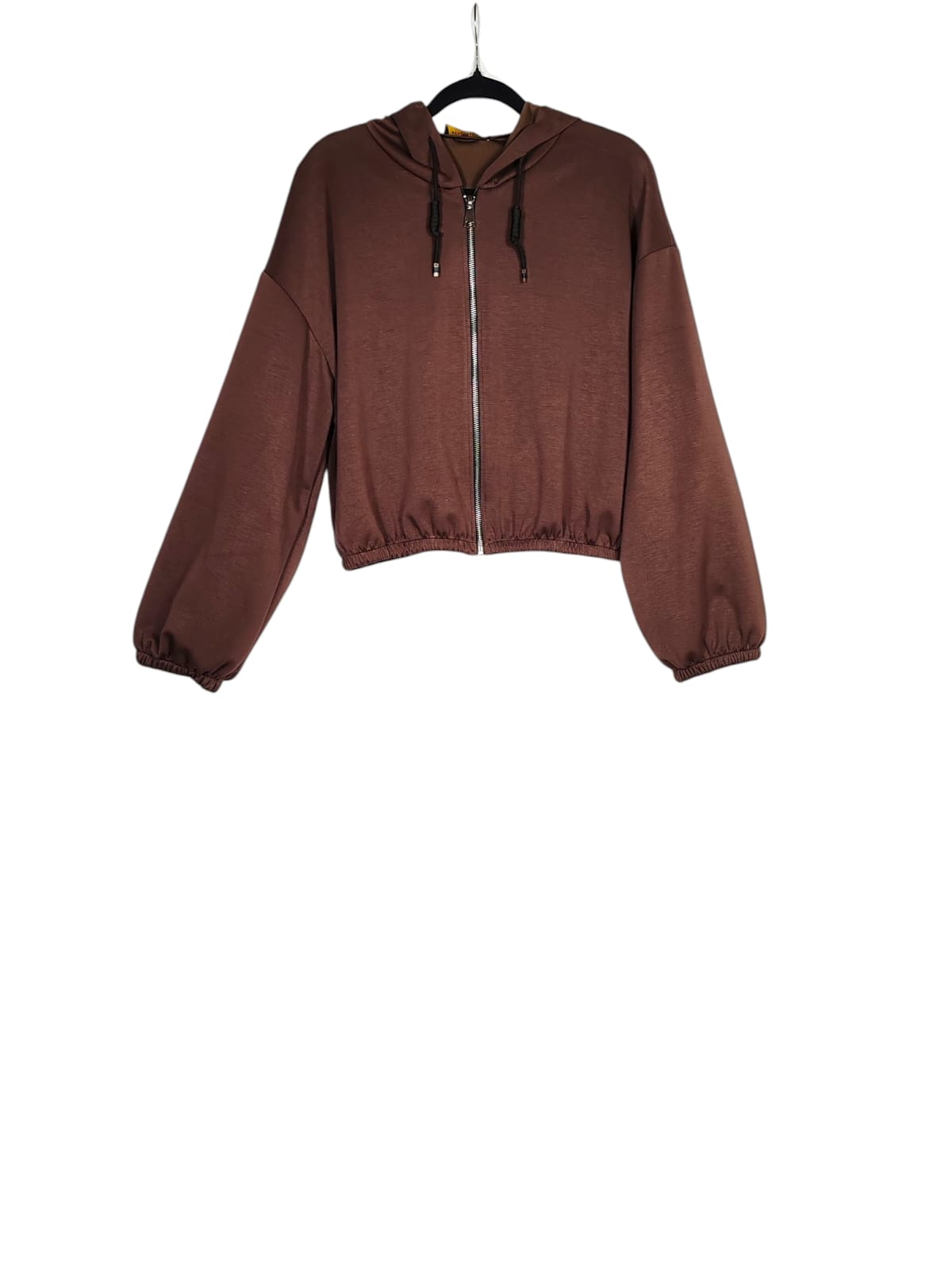 Felpa modello crop, con zip frontale e coulisse al fondo per regolare l'ampiezza. Le maniche sono ampie e leggermente a sbuffo. Pantaloni larghi con elastico e laccetto in vita. Colore cioccolato.